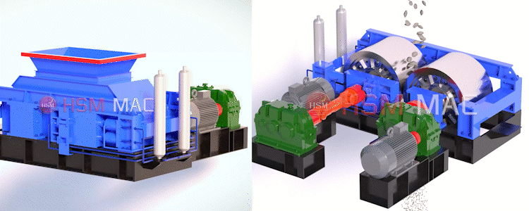 對(duì)輥制砂一體機(jī)是利用兩組單獨(dú)傳動(dòng)的輥軸,相對(duì)旋轉(zhuǎn)產(chǎn)生的擠軋和磨剪力來破碎物料。物料經(jīng)給料口落入兩輥之間,經(jīng)對(duì)輥擠壓破碎之后成品自然落下,當(dāng)遇到過硬或者不可破碎的物料時(shí),輥?zhàn)涌蓱{液壓缸或彈簧的作用自動(dòng)退讓,使雙輥之間的間隙增大,過硬或不可破碎的物料自然落下,以此來保證機(jī)器不被損壞,相向轉(zhuǎn)動(dòng)的兩個(gè)輥?zhàn)涌梢哉{(diào)節(jié)液壓缸或彈簧的壓力來控制產(chǎn)品的出料粒度。